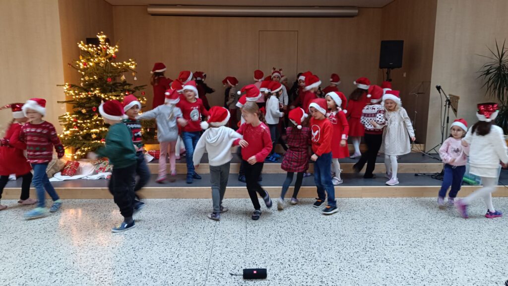 So herzlich willkommen geheißen, hatte der heilige Mann viele gute Worte für die Schulanfänger. Mit Blick in sein goldenes Buch konnte er die tollen Fortschritte loben; der Tadel, z.B. fürs Reden im Unterricht, fiel dagegen sehr gering aus. Lebhaft und schwungvoll führten die Klassen 1d und 1e einen Tanz vor – „Nikolaus und Nikoletta“ hüpften mit roten Zipfelmützen im Takt. Die Klassen 1b und 1c präsentierten dann noch das bekannte Nikolauslied „Lasst uns froh und munter sein“ in einer Cup-Song-Version.