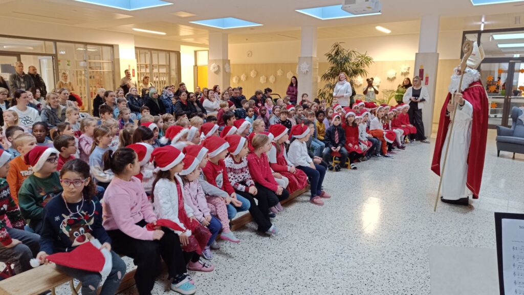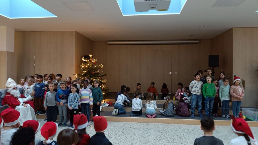 Himmlischen Besuch bekamen die ersten Klassen am 8. Dezember. Begrüßt wurde der Nikolaus kräftig von über 120 Stimmen mit dem Lied „Sei gegrüßt, lieber Nikolaus“. Die Musikschule mit der 1a schloss sich mit einem stimmungsvollen Lied an.